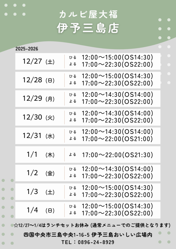 伊予三島店【年末年始】営業時間のお知らせ カルビ屋大福伊予三島店 2025-2026 年末年始営業時間 【カルビ屋大福 伊予三島店】 四国中央市三島中央1-16-5 伊予三島おいしい広場内 TEL:0896-24-8929 . ※営業時間については、今後の情勢により予告なく変更となる場合がございます。 皆様のご来店をお待ちしております。 Tweet